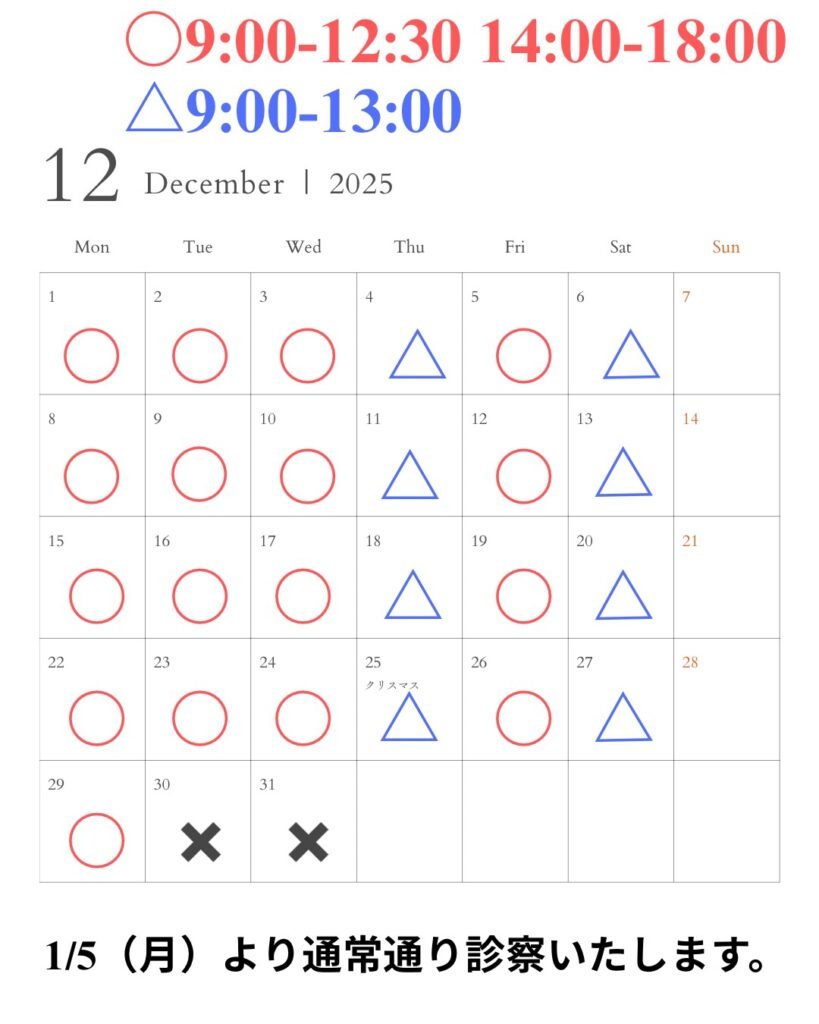 12月は29日まで診察いたします。ご確認いただければ幸いです。